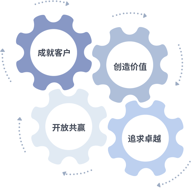成就客户是一切决策的出发点,创造价值是衡量所有工作的标准,追求卓越是开云kaiyun做事做人的态度,开放共赢是开云kaiyun的格局也是最终的结果。价值观的齿轮环环相扣,推动着组织里的每个人不断向前。